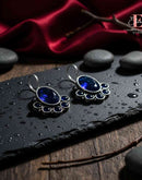 These elegant earrings capture the essence of midnight skies with their rich sapphire-blue stones. A teardrop centerpiece radiates brilliance, surrounded by a delicate arrangement of smaller blue cabochons in a blooming petal-like design. Set in antique silver, this pair blends regal charm with artisanal detailing—perfect for festive occasions, evening wear, and timeless ethnic styling.