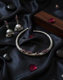 An exquisite oxidised silver choker set adorned with ruby-toned stones and delicate engravings. Paired with jhumkas featuring pearl clusters, this set is perfect for weddings and festive looks.
