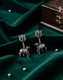 A powerful blend of devotion and artistry, these earrings feature the iconic Trishul paired with the revered Nandi motif, crafted in an antique oxidised finish. The subtle green stone adds a divine touch, enhancing the spiritual elegance of the design. Perfect for cultural festivities, temple visits, or for anyone who loves jewellery with symbolic depth and traditional soul.