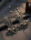 Graceful, artistic, and culturally rich — these oxidised long dangle earrings draw inspiration from the timeless beauty of the peacock. Intricate filigree work, teardrop motifs, and layered ghungroo clusters come together to create a statement piece that moves beautifully with every step. Perfect for festive occasions, ethnic outfits, and anyone who loves detailed heritage designs.