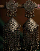 These antique oxidised earrings feature detailed shield tops, floral centrepieces, and cascading chains — a bold heritage statement for festive and ethnic wear.