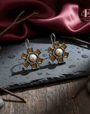 These exquisite earrings blend vintage charm with timeless elegance. Each piece features a luminous pearl at the center, framed by six amber-tinted square stones arranged in a radiant floral pattern. Set in an antique silver finish, the earrings create a soft yet striking contrast, perfect for elevating festive, ethnic, or contemporary looks. A statement accessory that adds sophistication with every wear.