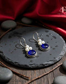 A graceful blend of classic elegance and modern charm, these earrings feature a deep midnight-blue stone framed in antique silver detailing. Three luminous pearls sit gently above the stone, adding a soft, feminine glow. Lightweight and versatile, this pair beautifully complements festive wear, evening outfits, and everyday elegance with its rich sapphire sheen.