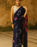 A rich deep-purple mul cotton saree featuring bold shibori-style white and magenta motifs. Ultra-soft, breathable, and effortlessly graceful—perfect for a chic, artistic ethnic look.