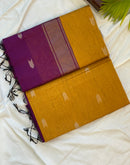 - Eterna Maheshwari Marigold Plum Saree – Mustard & Purple Zari Butta Handwoven Elegance