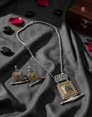 An exquisite necklace set crafted in antique silver and brass tones, featuring intricate square motifs and artisanal detailing. A true statement piece for ethnic and festive looks.