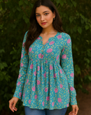A breezy peplum top in blue, enriched with pink block-print florals. Feminine, youthful, and perfect for casual pairing.