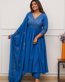A royal-blue Anarkali enhanced with floral yoke embroidery, complemented by matching pants and dupatta. Rich, graceful, and festive.