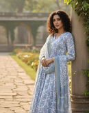 A dreamy powder-blue paisley Anarkali set crafted in soft cotton. Lightweight, elegant, and ideal for daytime festivities.