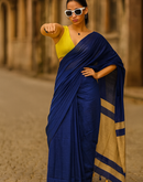 A timeless navy blue Khadi cotton handloom saree featuring a minimalist beige border with bold stripes. Soft, breathable, and effortlessly elegant—perfect for everyday grace with a touch of tradition.