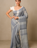 A serene mist-grey handloom saree featuring soft ivory stripes, crafted in a breathable linen-blend weave. Minimal, graceful, and effortlessly chic—perfect for everyday elegance or calm festive styling.