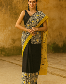 A chic black mul cotton saree elevated with artistic floral block prints in ivory and yellow, paired with a vibrant sunshine-yellow pallu for a striking contrast. Soft, lightweight, and effortlessly elegant—perfect for both daytime charm and evening sophistication.