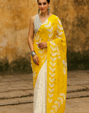A radiant yellow mul cotton saree featuring bold white leaf block prints paired with a soft ivory drape. Ultra-light, breathable, and perfect for effortless daytime elegance.