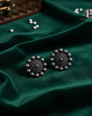 A striking blend of minimalism and vintage artistry, these matte black oxidised studs feature a textured central dome surrounded by bold bead detailing. Their all-black finish adds a contemporary edge,...